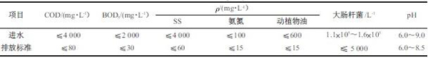 廢水產(chǎn)生有明顯的不連續(xù)性,每個季節(jié)以及每天的不同時段都不相同,節(jié)假日產(chǎn)生量較大,廢水中含有大量的血污、骨屑、肉屑、內(nèi)臟、腸容物以及糞便等污染物,固體懸浮物含量較高,有機物濃度高,油脂含量大,廢水呈紅褐色并有腥臭味,屬于較典型的有機污水,可生化性好。廢水處理設計**大進水量為6 000 m3/d,平均水量為250 m3/h。處理后達到肉類加工工業(yè)水污染物排放標準(GB 13457-92)中畜類屠宰加工一級排放標準。具體進水水質(zhì)及排放標準如表1 所示。