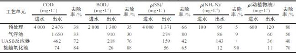 廢水**先經(jīng)過粗細兩道格柵,粗格柵設在進水口處,以去除廢水中較大漂浮物,細格柵設置在提升泵房后,用以攔截廢水中的碎毛發(fā)和部分懸浮物,格柵出水經(jīng)提升泵提升進入平流隔油沉淀池,一方面可以除掉漂浮的油脂、油塊,另一方面又可以使大部分不溶于水、密度大于水的雜質(zhì)沉淀下來。沉淀池出水自流進入曝氣調(diào)節(jié)池內(nèi),調(diào)節(jié)水量,通過曝氣充分混合均勻水質(zhì),同時進行預曝氣。廢水隨后進入氣浮池內(nèi),通過投加適當?shù)乃巹┗炷图訅喝軞鈿飧?,使水中的分散油、溶解油及其他部分雜質(zhì)、SS 得到很好的去除。氣浮池出水進入UASB 厭氧池進行生化處理,通過微生物作用將復雜的有機大分子物質(zhì)降解為簡單的有機物。廢水經(jīng)UASB 后自流進入接觸氧化池,有效去除COD 和NH3-N。氣浮池、UASB 厭氧池、接觸氧化池剩余污泥進入儲泥池濃縮后,在污泥脫水車間用帶式濃縮脫水一體機進行壓濾脫水,干污泥定期外運處置,儲泥池上清液和壓濾液回流到廠區(qū)污水系統(tǒng)進行再處理。