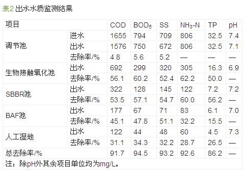 由于豬場(chǎng)沼液的碳氮比低,可生化性差,不適合微生物生長(zhǎng),故定時(shí)向廢水中添加一定量的營(yíng)養(yǎng)物,以提高B/C。系統(tǒng)運(yùn)行至今,各單元處理效果穩(wěn)定,經(jīng)生物接觸氧化、SBBR、BAF、人工濕地處理后,出水水質(zhì)可滿(mǎn)足《畜禽養(yǎng)殖業(yè)污染物排放標(biāo)準(zhǔn)》(GB 18596—2001)中的相關(guān)要求,監(jiān)測(cè)結(jié)果見(jiàn)表2。