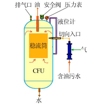 CFU工作原理如圖 1所示。采出水主體水流先經(jīng)自制的微氣泡發(fā)生器注入大量的微氣泡,然后沿切向入口進(jìn)入浮選罐,在罐壁與內(nèi)部穩(wěn)流筒之間形成的環(huán)形空間內(nèi)產(chǎn)生旋流,旋流引起的離心力場驅(qū)使氣泡與油滴**黏附,黏附氣泡后的油滴與水的密度差進(jìn)一步加大,進(jìn)而加速浮升,提高了油水分離效率,實(shí)現(xiàn)對生產(chǎn)水的**處理,同時大大縮短水力停留時間,減小了處理設(shè)備的尺寸。其中,自行研制的微氣泡發(fā)生器利用微孔發(fā)泡機(jī)理,通過微孔對氣流進(jìn)行連續(xù)剪切后經(jīng)水流沖刷而形成微氣泡,有效規(guī)避了常規(guī)氣泡發(fā)生方式能耗高、產(chǎn)生氣泡性能差、剪切乳化程度高等不足〔4, 5, 6〕,微氣泡發(fā)生器的優(yōu)越性能也為CFU除油效率的提高提供了保障