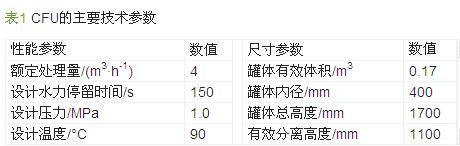 CFU的浮選罐外形尺寸為D 0.4 m×1.7 m,微氣泡發(fā)生器外形尺寸為D 76 mm×700 mm?,F(xiàn)場試驗(yàn)時CFU采用2個立式氣浮罐串聯(lián)成撬,總體尺寸為1 430 mm×1 200 mm×2 370 mm,凈重≤1.5 t。其他參數(shù)如表 1所示。